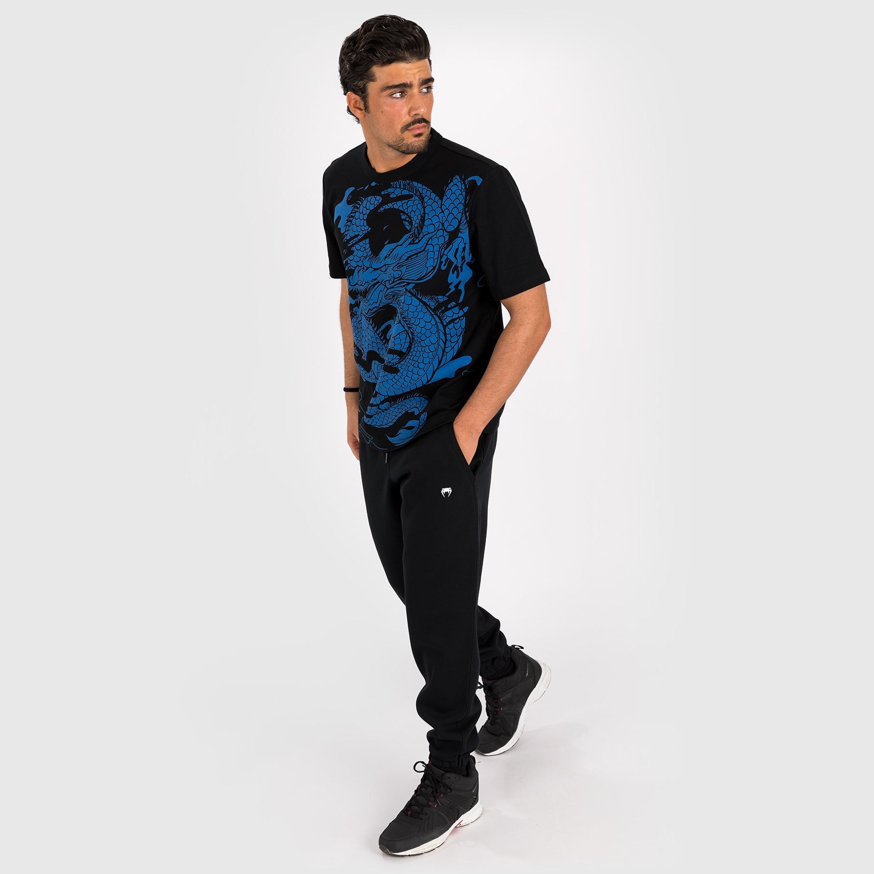 Le t-shirt Venum Dragon's Flight  est un t-shirt graphique à col ras du cou avec le dessin complexe d'un dragon chinois, capturé en plein vol et enflammé, en bleu nuit. Le motif s'étend sur la poitrine et l'ensemble du dos de ce t-shirt noir. Une petite étiquette brodée avec le logo Venum sur la manche ajoute une touche de finition à ce tee-shirt.